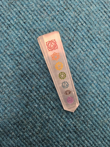 Crafted from Selenite, this elegant point features symbols for each chakra. Enhance your energy work and meditation with this sophisticated piece.